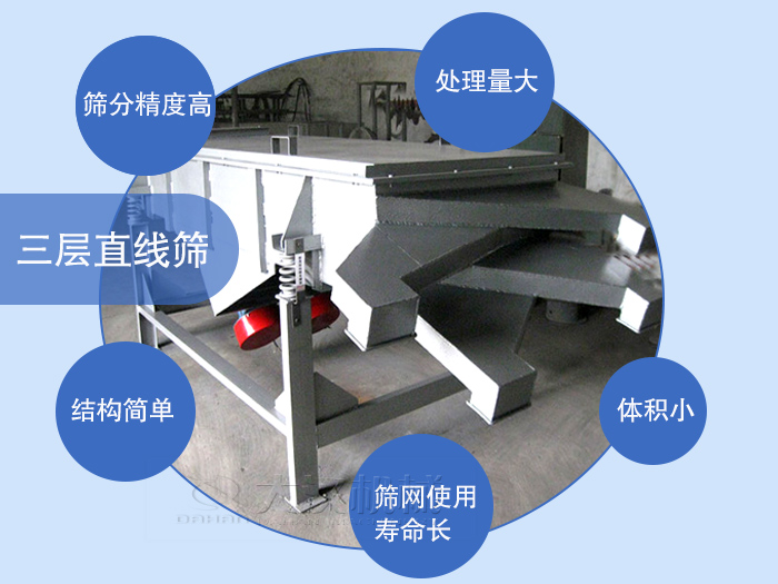 520三層直線振動篩體積小,移動方便,篩分精度高、處理量大、結構簡單、耗能少、噪音低、篩網使用壽命長、密封性好、無粉塵溢散、維修方便、可用于流水線生產中的自動化作業。